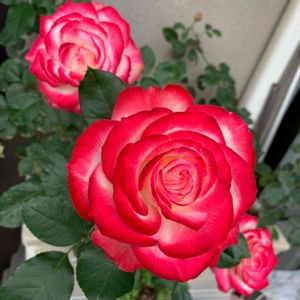 《今咲いている、薔薇》 今咲いている薔薇から、イブ・ピアッチェ(上・中)とジュビレデュ・プリンスドゥモナコ(下)を🌹☘️✨。(9/2撮影) *芍薬のように豪華に咲く、香り良いイブ・ピアッチェ💕 *白色と紅色のバランスが美しく、華やかなジュビレデュ・プリンスドゥモナコ🇲🇨 *背景の写真は、マーガレットコスモスです🌼🌼🌼✨
