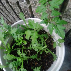 春菊🌱 だいぶ育ってきたので摘心しました(摘んで鍋物にin!)✂️ 前から薄々気付いていましたが、勝手にミニトマト生えてます😅