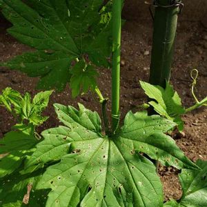グリーンカーテンのゴーヤ、葉が点々に透けている😲 摘心もして元気よく伸びてはいるけど、どうしたものか…少し様子を見てみよう👀