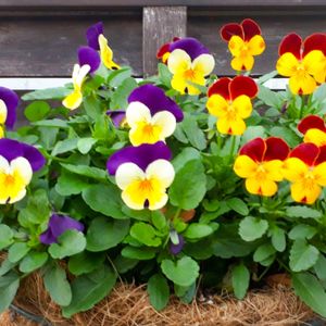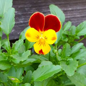 摘心したハンギングバスケットの赤黄ビオラさん🌼 ようやく一輪😊