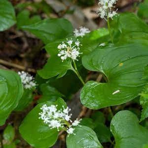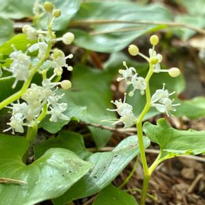 マイヅルソウ キジカクシ科マイヅルソウ属 多年草 北海道南部〜九州に分布 亜高山帯の針葉樹林の林床などの薄暗い場所に生える。 葉の形が鶴が羽を広げて舞を踊っているように見えるので、「舞鶴草」と呼ばれる。 花期5〜7月 高さ10〜20cmで、途中に2枚のハート型の葉を付ける。 茎の上部からの下2〜5cmの花茎に、長さ3〜6mmの花が10〜20個総状に集まって咲く。花被片は4個で白色、雄しべは4個である。 花言葉は「汚れがない」 🏷️金曜日の蕾たち に参加させていただきます。