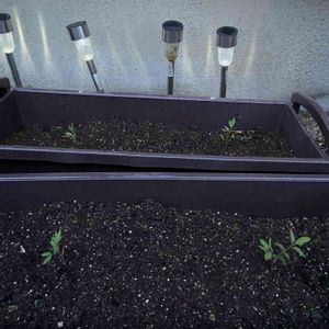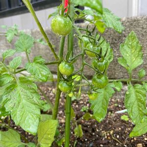 本物の実トマトから取った種からの苗が2つ×プランター5個で10の苗🍅 小さなところからこのプランターに植え替えました。
