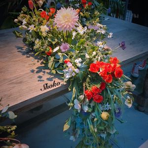 ウォーターフォール・アレンジメント の練習。 ウェディングのデスクで使えます (これはマジで重い....)(本番は現場で作るので重さは関係ないですね)
