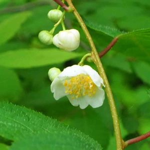 マタタビ(木天蓼) 「猫にマタタビ」🌿🐈️のマタタビの花です。梅の花に似て、下向きに咲いてました。控えめなお姿💠。 花期に、花粉を運んでくれる虫に花のありかを教える為に、枝上部の一部の葉🍃が白色になってます。果実は、塩漬けにして酒の肴🍶、実に出来た虫コブは、漢方薬💊。猫にも人間にもお役に立つ植物です🐈️ニャン。(日光植物園)
