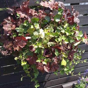 おはようございます₍ᐢ⑅•ᴗ•⑅ᐢ₎♡春に作成した ヒューケラとアイビーのハンギングバスケット もりもりになってきました💦🎶 花も咲いてます🤗
