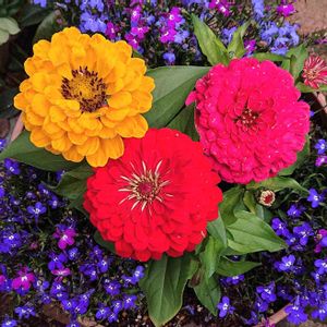 ジニア・ロベリアの寄せ植え🍃 黄色とピンク色のジニアと反対色の青・紫色のロベリアの寄せ植えしました。派手な色の取り合わせの一鉢になっちゃいました😲。朝見ると、目が覚めます👀🎶。
