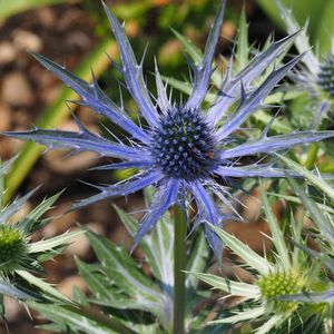 エリンジウム なんとも目を引くユニークな花姿😍。青色の涼感ある花です。何年か前の6月、軽井沢のレイクガーデンでの一コマ🐝。