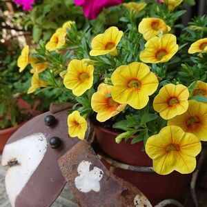 カリブラコア 我が家の玄関でお出迎え。年季が入ったワンちゃんの鉢カバーに、黄色の可愛いカリブアコア。 雨に当たらない所なので、花色良く咲いてくれてます🐝🎶。