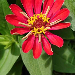 ジニア モコモコの大花ジニアの二番花が開いたのですが、あらら?何で大花が咲かないの?・・・と思って良~く観察したら👀、花弁の中に黄色の小さい花が散りばめられているではありませんか。まぁなんと愛らしい花姿。思わずパチリ📷️🐝。