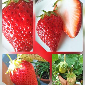 🍓あんまり大きくて綺麗だから、また見てね🍓 去年の秋から育ててる 🍓章姫(アキヒメ) 1月には大きいのが出来て まとめを作るほど大喜び! その後だんだん小さくなってきたけど 細々と、出来てはいました💕 そしたらまたまた大きいのができ始めました! 縦5.5センチ 横4センチ とーーっても甘くて美味しかった😋 右下の状態から一週間で こんなに赤く大きくなりました🤩 この喜びを是非、皆さんにもお伝えしたくて💖