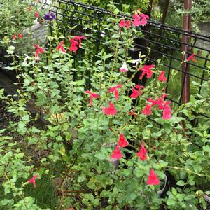 おはようございます😃 涼しさを通り越して寒い朝です☂️ 暑い時期はお休みしていたチェリーセージが花を咲かせ始めました 今のところあか組が優勢です