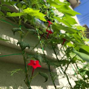 おはようございます 朝から太陽がギラギラです🌞 星咲きルコウソウの花が咲き始めました グリーンカーテンの一部なのですが、まだカーテンとしては機能できていません💦