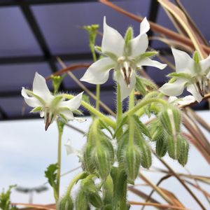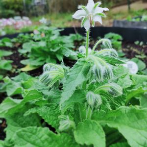 曇り空の下、ボリジの白いお花が咲きました😊3株植えた3株とも、揃って一輪ずつ咲いていて、なんだか凄いなぁと思いました✨青いボリジはもう少し後の開花になりそうです。