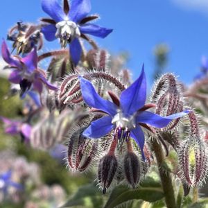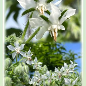 🤍💙ボリジ💙🤍 毎日暑いですね🥵 連日の猛暑日続きで、今日は37℃超え🔥 まだまだ猛暑日続くそうです🫠 1️⃣ 涼しげに見えなくもない?ボリジのお花達💙💙💙 2️⃣ こちらはボリジの白花の芽🌱🌱🌱 以前投稿していた白花の元株は、風で倒れて折れました😣 大量に🌱出ています。間引いた方がいいのかな?あんなにせっせと白花の種とりしたのに😂必要なかったですね😅