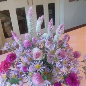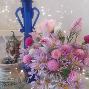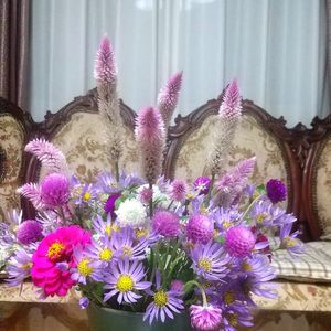 庭の花 🌿🌸🌼💜🌿🌸🌼💜🌿🌸🌼💜🌿🌸🌼💜 私の大好きなシオンと千日紅、ホルンを生けました。 皆とても優しい色です😃🌸🌿
