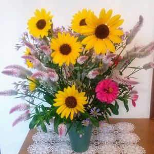 庭の花 🌿🌸💛❤️💜🌿🌸💛💜🌿🌸💛💜🌿🌸💛 台風前にひまわり、シレネ、ホルン、ジニアとっておきました。 久しぶりに沢山の花をいけるの楽しいな😃🌸🌿