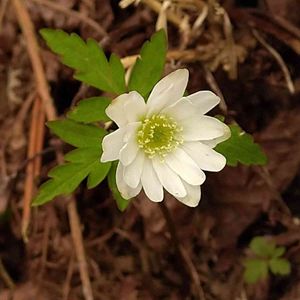 白い花に見えるのはがく片で、花びらでは無いそうです。 暗い林内で一輪咲いていました。 キクザキイチゲです😄 イチゲ(一華)とは一茎に一輪の花を咲かせる意味