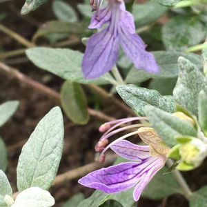 枝を直角に伸ばすツリージャーマンダー、小さくカットしたけれど薄紫のお花が咲き始めました。