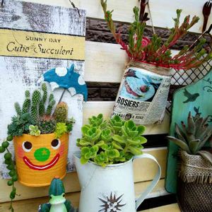 多肉とみどりのマルシェでお迎えした、doriさんの顔缶タブロー✨ 小さなさぼちゃんを寄せ植えしてみました💞 傘は取り外してピックになります☔ シールが可愛いのでしばらくはそのままで~☔ 顔缶の笑顔にいやされます~(*´▽`*)♪♬*♡☆