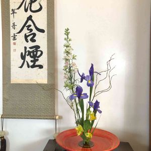 アイリスが大きく開きました。小さな種や球根から空へ向かって花を咲かせる植物のエネルギー、圧倒されます。 花器:日本製水盤 花材:アルストロメリア、ウンリュウヤナギ、アイリス、ラークスパー