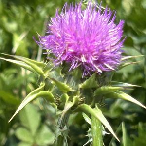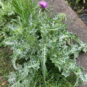 小石川植物園の散策 💖大薊(オオアザミ)💖 キク科オオアザミ属 開花期5〜6月 葉には強いトゲがあり草丈が1m以上になります 葉にはミルクをこぼしたような白い模様があるのが特徴です 食欲増進や消化促進作用があり、肝機能の改善、解毒作用、抗酸化作用があり幅広く利用されています 種子に含まれる成分が、肝臓を守るサプリメントとして用いられ人気が高まっているとか