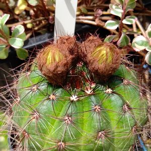 わあ、真ん中の茶色の毛が膨らんできた ( *´艸) 札の名前も消えて、カラカラになってたから、安くしてもらって救済してきた子💕 やっとプクプクしてきて、真ん中に茶色の毛で覆われた粒が出てきてた。 久々に見てみると、真ん中に1センチより大きい花芽が‼️ えっ、お花が咲くの?どんな色?どんな形? ワクワク😃💕