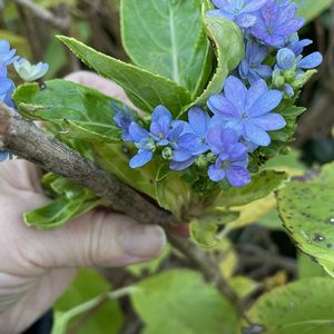 アジサイの狂い咲きが可愛すぎる🩵💜 葉は枯れる寸前なのに枝の根元でひっそりと 大きな葉に隠れるように咲いてました💜🩵