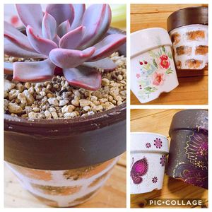 やっぱり初心者には素焼き鉢かな? と思うものの、室内に素焼き鉢は味気ない感じ。。とゆーわけで初めてのデコパージュ鉢してみました!多肉ちゃんが引き立つようやシンプルめなのが理想で。。 雑な感じですが。。。(*´-`) 鉢はお花屋さんの素焼き鉢。材料はほとんど100均。これ水とか通気性とかどうなるんでしょ? 多肉ちゃんに大丈夫なようなら、色々材料を揃えてやってみたいo(・x・)/ アクリル絵の具とかも買ったのですが、今日は力尽きたのでまた今度で。。