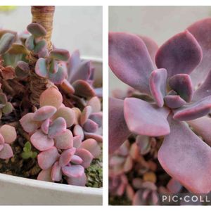 デビー (多肉植物) ガチャで出た〜 かき氷🍧セット😚💓 デビーといっしょにパシャリ✨ ちょっと。。。涼しく感じます🎵 薄紫色の葉がバラの花のような ロゼット状に広がり 横に大きくなりました😊 別名 パープルクィーン💜✨