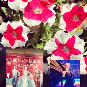 🍀 ペチュニア バカラ ローズピコティー🍀 神戸の人工島、六甲アイランドにある ファッション美術館で華麗なる 宝塚歌劇・衣装の世界展が開催 されています💖 豪華な衣装が美しい麗人の写真などと 共に多数展示されていました😊 🤍🤍🤍 美術館の前庭には紅白バイカラーの ペチュニアが目を惹いていました💕