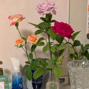 2024年8月13日(火)、晴れ。 猛暑続きで、やる気が起こらず、バラはほぼ、外で咲かせていた。 今日は、婿さんのお母さんが我が家へ来られるということで、午前中にバラを切り採り、花瓶に生けた。 婿さんのお母さんは、私より10歳年上である。 我が家で、娘がすき焼きを用意して、ランチをともにした。一階のダイニング・キッチンルームの出窓辺に飾り付けた。 婿さんのお母さんは、緊張されてか、飾り付けたバラに気づかれなかったようなので、ランチを済ませ、雑談をし終わって、席を立たれるときに、出窓を指さして、このバラとこれとそれは、香りが、とても素敵ですよ、と言うと、振り返られて、花に鼻を寄せて香りを嗅がれた。 エマが一番、気に入られたようだ。 さて、投稿写真は、 ①アンジェラ ②エマ ③オデュッセイア ④ブラスバンド ⑤ブルー・リバー である。そのほか、エリナ、レオナルド・ダ・ヴィンチ、ゴスペルを飾り付けた。 日本の気温記録史上、今年の7月の平均気温は過去126年中で最高記録になった。多分、8月の平均気温も最高記録になると思われる。 この3日間は、水やりを朝と夕方に2回、行っている。 今日も水やりをこれから行う。 バラは本当にたくましく、こんな猛暑なのに、花を咲かせる。ペチュニアやカリブラコアも見事に咲いている。 花達よ、ありがとう、その生きる姿に感動する。