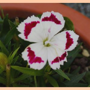 背丈10cmくらいで次々に花を咲かせて、 四季咲き、多花性、 お花の一つ一つはかなりの存在感。 何より、ナデシコにはめずらしい、 このワインカラーと白のコントラスト、 全部ツボ、大好きな花です。