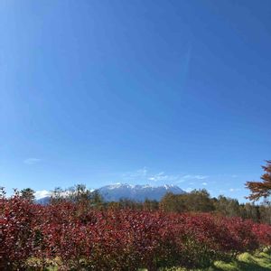 木曽町 木曽馬の里にて ブルーベリー🫐が見事に紅葉していました バックは雄々しい御嶽山。