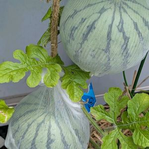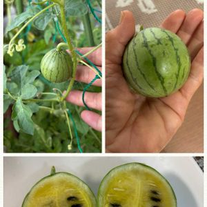 家庭菜園🍉 バルーン小玉スイカ受粉から41日目🎶 収穫です🧤🎶 1️⃣ラグビーバルーン小玉スイカ🍉 2⃣収穫しました☺️🎶🎶 ミニミニスイカ🍉 3️⃣今日の収穫💞 4️⃣夕飯後に🍉食べました〜🤤🤤🎶🎶🥄 ミニミニ🍉だけど甘くて美味しかった〜☺️
