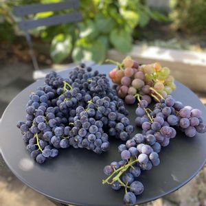 こんばんは♪ ① 先日、遠方より友達が🍇葡萄を取りに来るので、収穫しました。 友達にはウチの葡萄の挿し木苗をあげてましたが、今年二年目で10房の🍇がなり喜んでいた矢先に、アライグマに全部食べられてしまってたの😨 孫ちゃんにも成長の過程を見せていて、葡萄狩りをさせようとしていたのですが、、 孫ちゃんにアライグマに食べられたとビデオLINEで伝えたら、😭泣いて悲しんだらしいの。 そんなこんなで、豊作の葡萄のお裾分け🤗🎶孫ちゃんの笑顔が目に浮かびます。 ②これから来客なので、🍇紅伊豆を収穫。色付きは進まなかったけど、酸っぱかったのが和らぎ甘くなってました😆🎶 ③ オカワカメの花 滝の様に満開に咲いてます。 甘ーい香り🥰