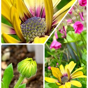 画像1.2/オステオスペルマム やっと花びらが開きました ╰(*´︶`*)╯♡ 8分咲きってところかな… 他にも蕾が幾つかあったので次々咲いてくるのが楽しみ♡ 画像3/オシロイバナ 散歩道で… 画像4/ナス 秋になってからチラホラと実がなってます〜 画像5/今日の収穫♪
