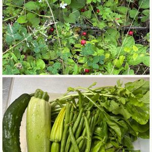 こんばんは〜 遅くなったけど… 今日、キュウリの初収穫。 ズッキーニは6〜7本収穫済み ピーマンの第一果を収穫。 まだ3センチくらいの赤ちゃんピーマン🫑 インゲンとキヌサヤ、ルッコラはそろそろ終わりかなぁー 貸農園の駐車場🅿️ではヘビイチゴの実とドクダミの花の共演