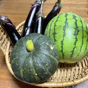 今日の収穫🥒🍆🌿 お土産は大鹿村の塩最中 よもぎや甘栗、ブルーベリー🫐と、 色々な種類があったのネ〜😋 @大鹿村 南信州