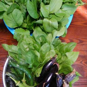 ほうれん草、小松菜、チンゲン菜、水菜、わさび菜、 なす、キュウリ、オクラ 沢山収穫できました🎵💕 何を作ればいいのかな⁉ 迷います😥