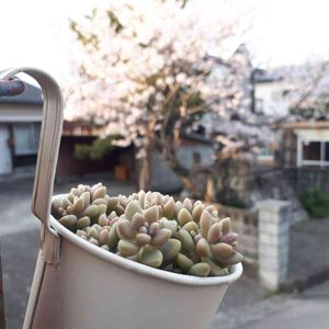 こんにちは 今日の多肉は姫秋麗 隣の家の桜は満開 朝 台所の窓を開けて 桜の咲き具合を見るのが日課になっています😊