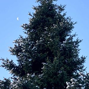 トウヒ🌲 今朝の月◯ 今朝はうっすら雪が❄︎ ホワイトクリスマス❄️ ˖ ࣪⊹ ④庭のローズマリー🌿 ⑤ブルーアイス🌿 穏やかなEveを*↟⍋↟*🍃