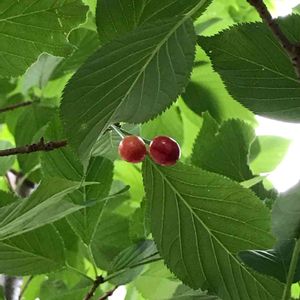 昨日の夜のヤツなんです。 大島桜という伊豆大島でよく見かける桜なんだそうで、白い花と若葉の緑のコントラストが美しい桜……… と札がありました🎵 今は葉が美しいのと、サクランボが実を結んでおりました。 毛虫が落ちてこないうちに退散退散💦