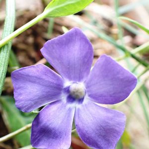 ツルニチニチソウ(蔓日日草) 蔓を伸ばし放題なので 引っこ抜いてたら この花一輪が目に入りました。小さく可愛いのでパチリです。