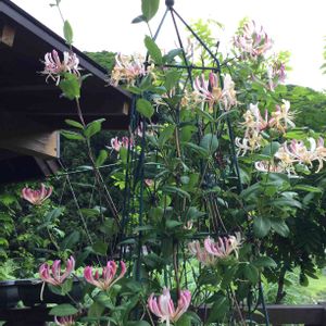 2年ほどから体調不良で ガーデニングもできませんでしたが 今年はちょっと動ける様になり 少しずつ始めました 5月 最初にしたのは ハニーサックルの植え替えで プランターのトピアリーから 丁寧にやっとほどいて 地植えにしました 空いていたラティスに 結びつけ蔓を絡ませ 今では 地面にも落ち着いて 蔓を伸ばし始め蕾も付きました