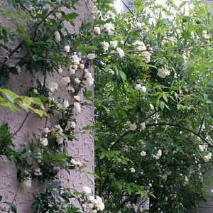 白モッコウバラが三分咲き程です🌹🍃 雨がやみ、暖かな陽射しを待ってます👍