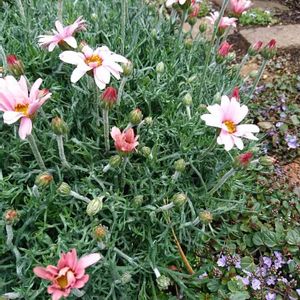 うちのローダンセマムちゃんも やっと開花💗 去年 地植えにしたら すごいボリュームです( *^艸^*) ベロニカ マダムマルシアさんも 春になり復活♡♬*増えてきました💜 薄紫色に斑が入ったような小花が綺麗ですよ~❀✿