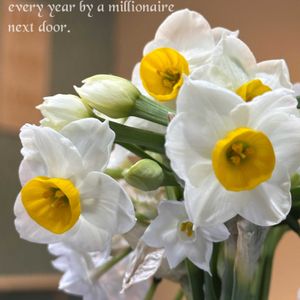 お隣りの大富豪さんから頂いた花🌼 毎年、年末に…水仙と千両のお花を、お正月用にとくれるんです。 今年は庭で採れたレモンも10個🍋 くれました♪ 某有名自動車会社の社長さんだったようで…(本人からは言わないのよ)他の人から聞いて後から知ったんです。 庭には錦鯉の居る大きな池があったり滝が流れていたり、橋がかかっていて渡らせてもらったこともありました😆 住宅街にこんな場所があるとは! 庭にはレモン🍋、琵琶、柿、薔薇、枝垂れ桜、名前もわからないけど立派な大木などなど…沢山あるから、私の庭とほんの一部分しか隣接していないけど、なぜかウチだけよくしてくださって😅 その方の家が大きな庭だから、隣りとは言え、うちまで自転車に乗って、お花を届けに来てくれるんですよ〜😅 金運があがりそうな気がしちゃうわよね😆