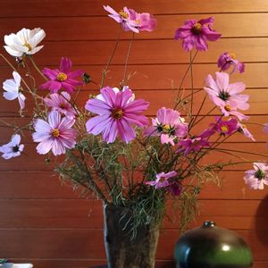 ご自由にお持ち帰り下さい 新聞紙にくるまれて 水を張った樽の中にたくさんの花束💐 母といつも通っている県のスポーツ施設です🏓 遠慮なくいただくことにしました 写真は母が持ち帰った分で 実家の玄関に飾ったところです 因みに 花瓶は私が中学の時の作品で今も活躍中!この頃から 織部の釉薬を好んでいたなぁとシミジミ… で、私が持ち帰った分は 職場のテーブルに分けて生けておきました コスモスって たぶんほとんどの人が知ってますよね 見慣れた花にホッとしてもらいたいなぁ~と ちょっぴり早くに出勤しましたよ ほんのりいい香り~ 幸せのお裾分けの話でした イイ肉(11/29)の日です たくさんお肉を食べましょう 鶏胸肉が認知症予防に効果があるとか… 一番安いので嬉しい情報聞きました👂 寒くなってきましたが 元気に頑張りましょうね😄💪