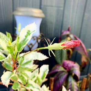 斑入り葉ハイビスカスのスノーフレーク✨🌺✨ 雨上がり、記念すべき今季一番花❣️ 下向いちゃって、綺麗お顔が撮り辛いので、ただ単に上から撮りました🤣 次はどこ咲くかなぁ、と見たのですが… 蕾が見当たらないです💦 暫く咲かないなぁ🤣