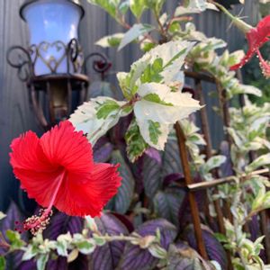 葉っぱが僅かに紅葉して来たハイビスカス スノーフレーク✨🌺✨ 綺麗な斑入り葉だけでも十分なのに… この色の変化は、毎年楽しみです😄💕